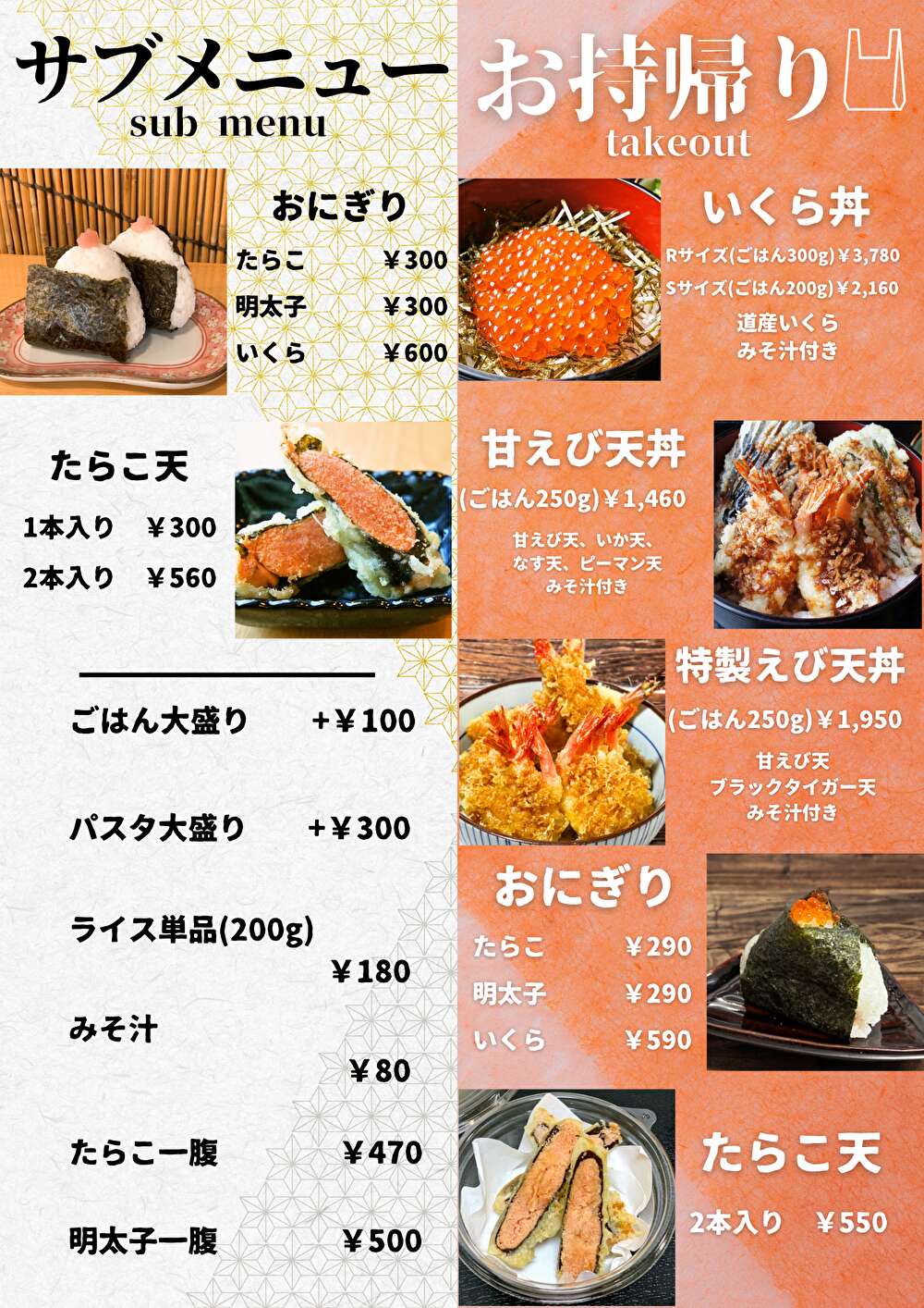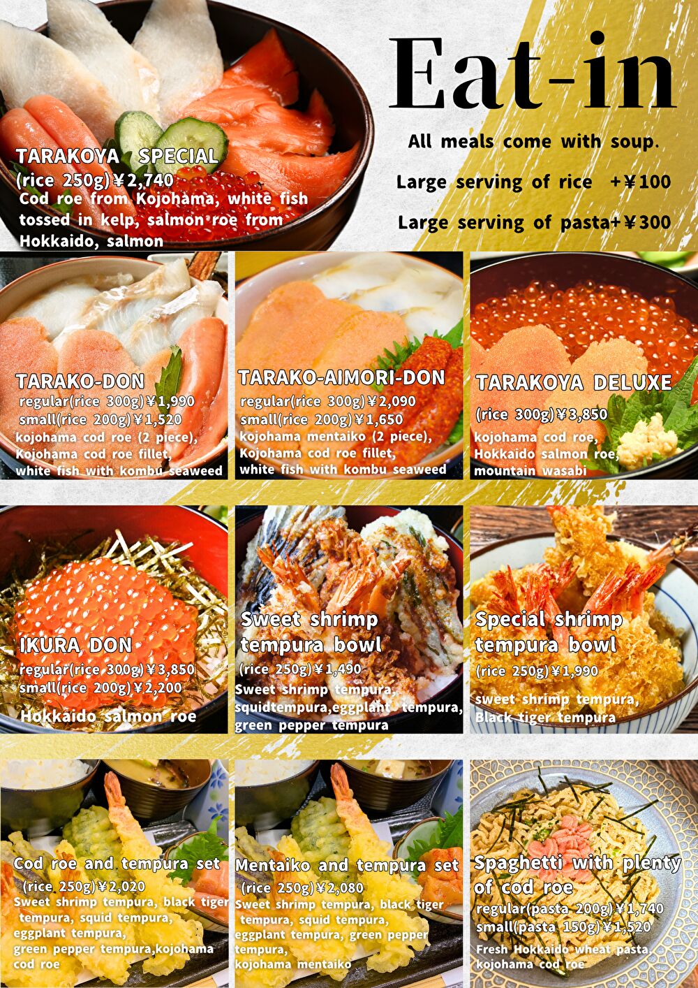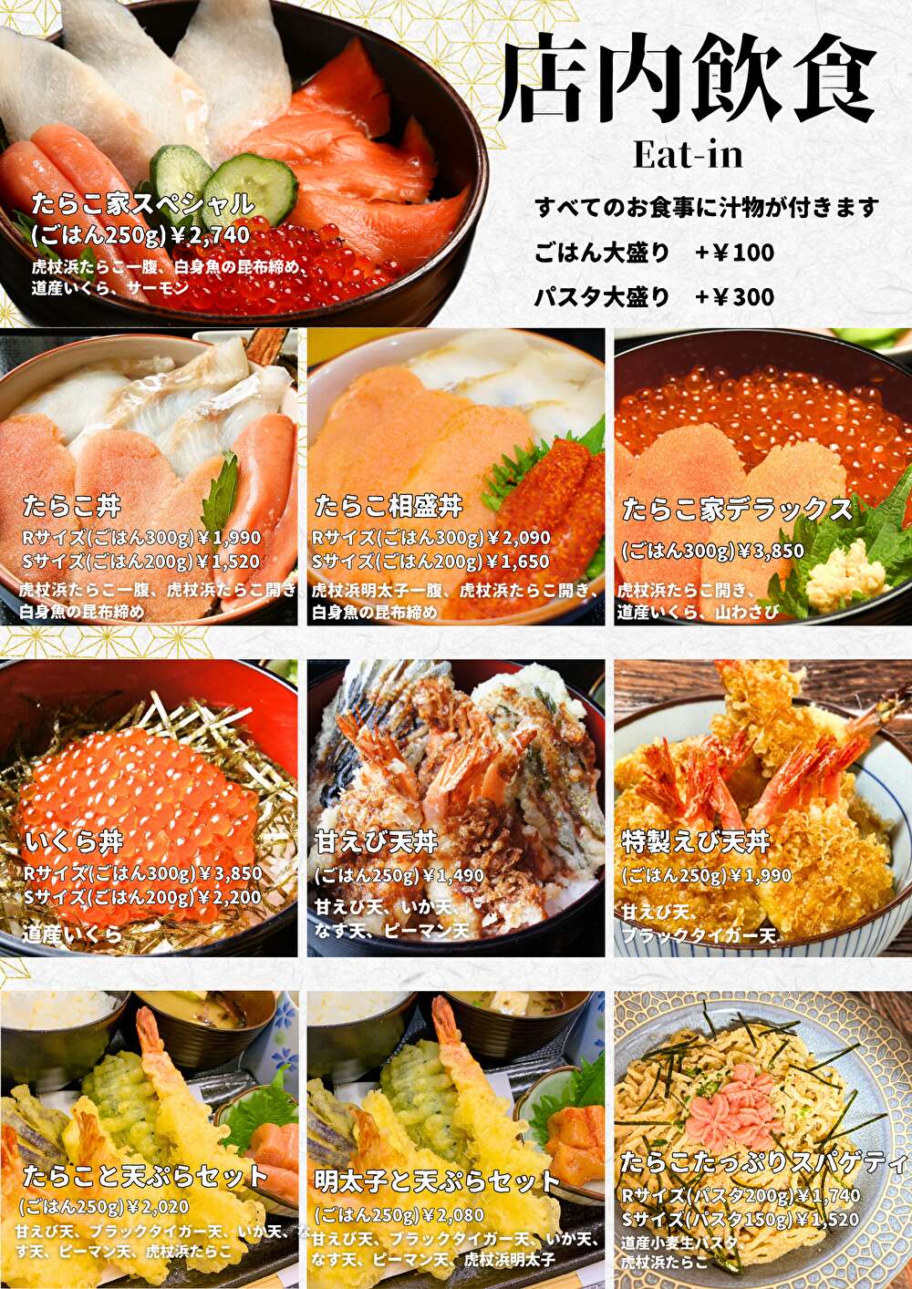 虎杖浜たらこを使用した「たらこ丼」はもちろん、サーモンやイクラものった「たらこ家スペシャル」、北海道の明太子も味わえる「たらこ相盛り丼」など、たらこメニューが満喫できる。